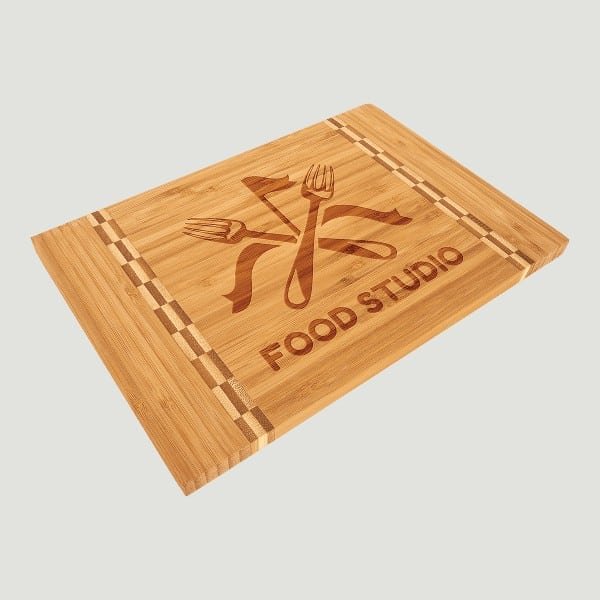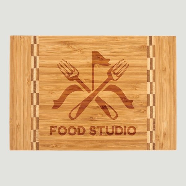 12 x 8 1/4 ” Rectangle Bamboo Cutting Board with Butcher Block Ends. Bamboo includes natural variations in color in wood grain and engraving, adding to the uniqueness of each piece. Your custom design will have a richly toned, deeper hue than the cutting board itself when engraved.
