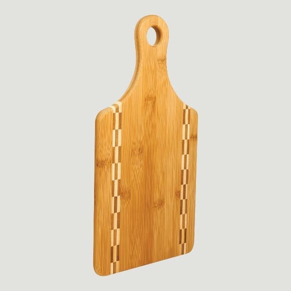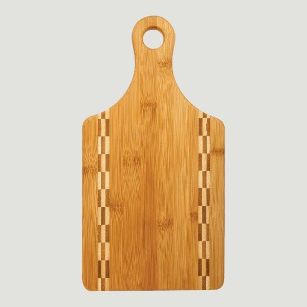 Beautifully crafted 13 1/2 x 7″ natural bamboo cutting board with handle and butcher block inlay. Can be laser engraved for personalization.