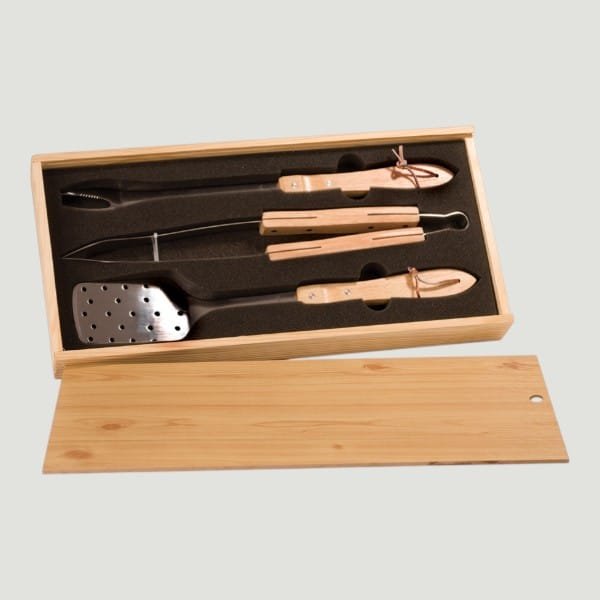 Includes 1 each stainless steel spatula, tongs & fork with solid oak handles.