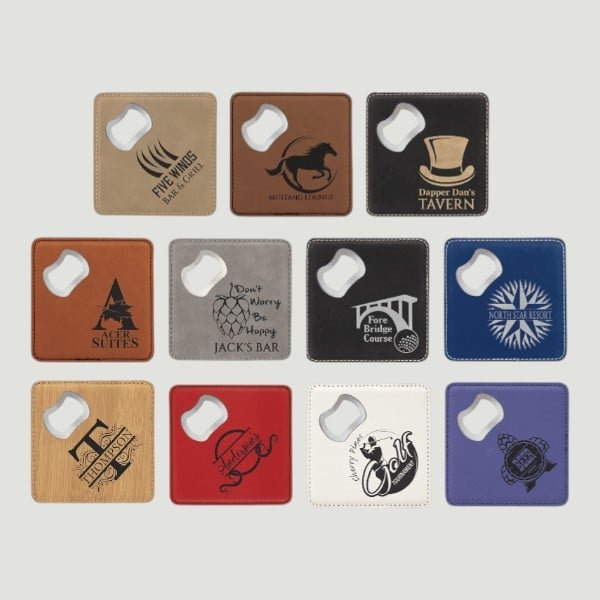 This is a neat little “two for one”! Wrapped in the beauty and durability of leatherette, this 4″ coaster has its own built-in bottle opener! Perfect for a man cave, or a wedding or house warming gift, a souvenir of a special event, or a promotional item to get your business or organizations name out in the public eye.