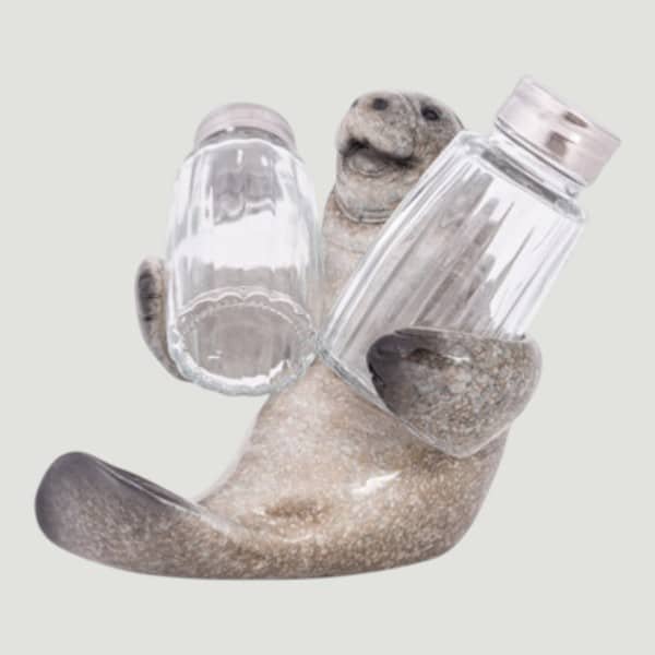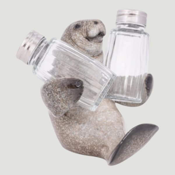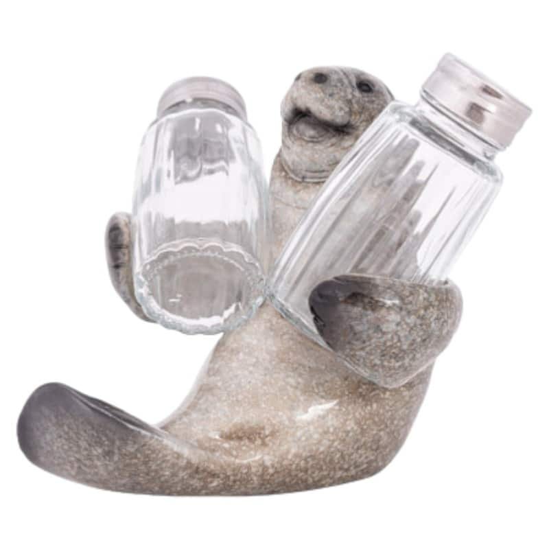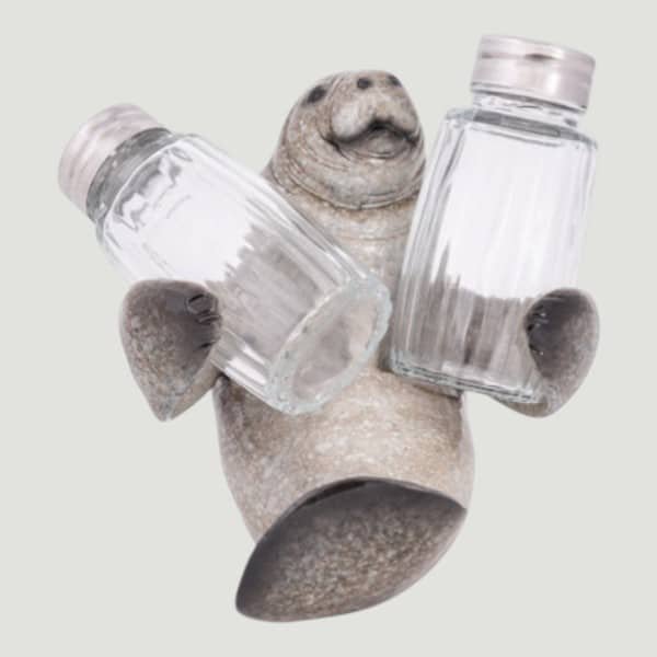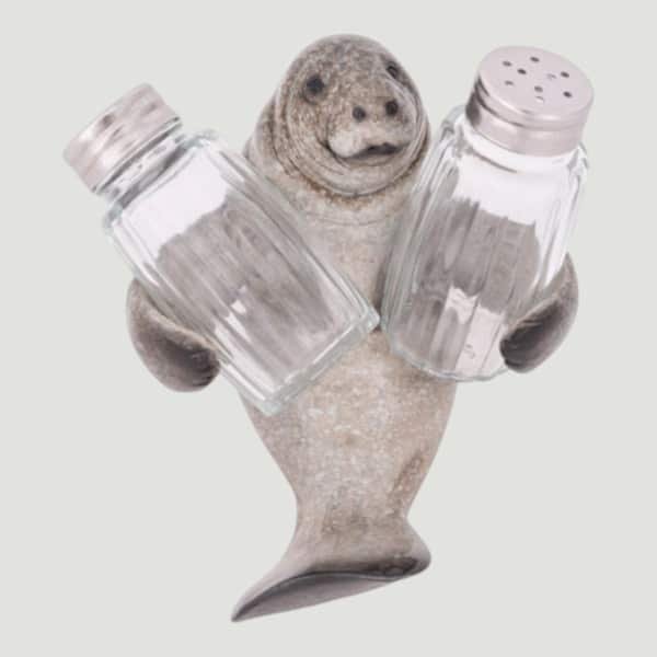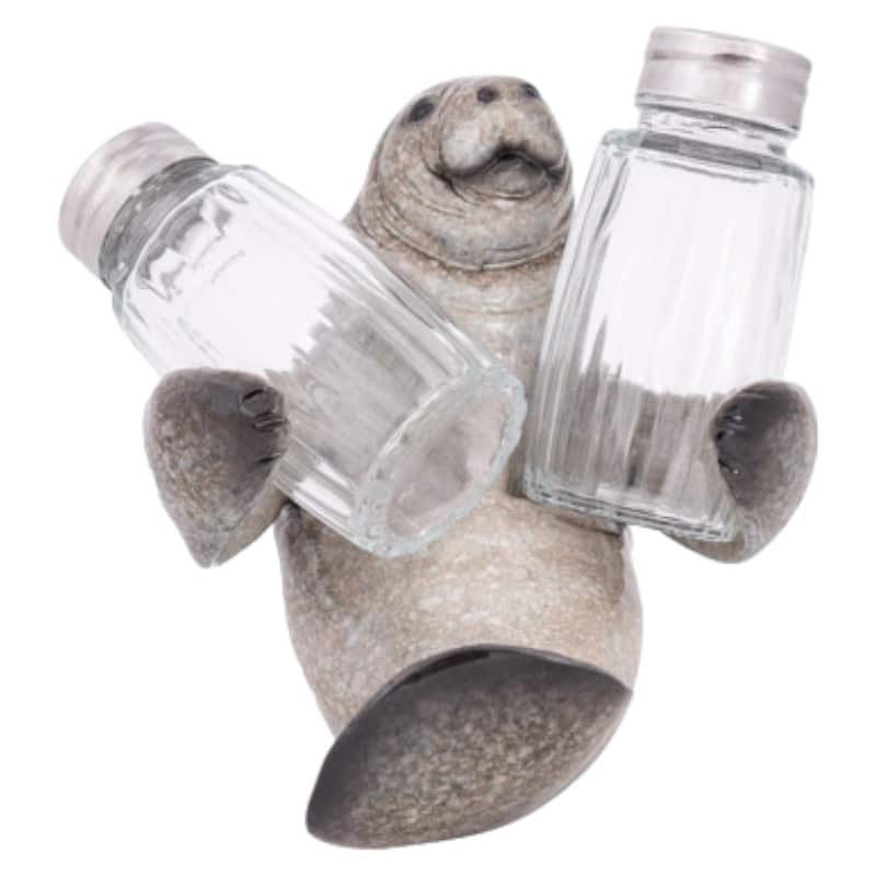 5″ High It’s Florida’s Beloved Marine Mammal, it’s a Manatee or a Sea Cow and This One is a Holder for Salt and Pepper Shakers Included – It’s Made of Polystone and the Shakers are Glass and Metal – It’s Practical and Makes an Interesting Coastal Kitchen Accent on the Table or Counter Just Waiting For You to Take a Shaker to Use.