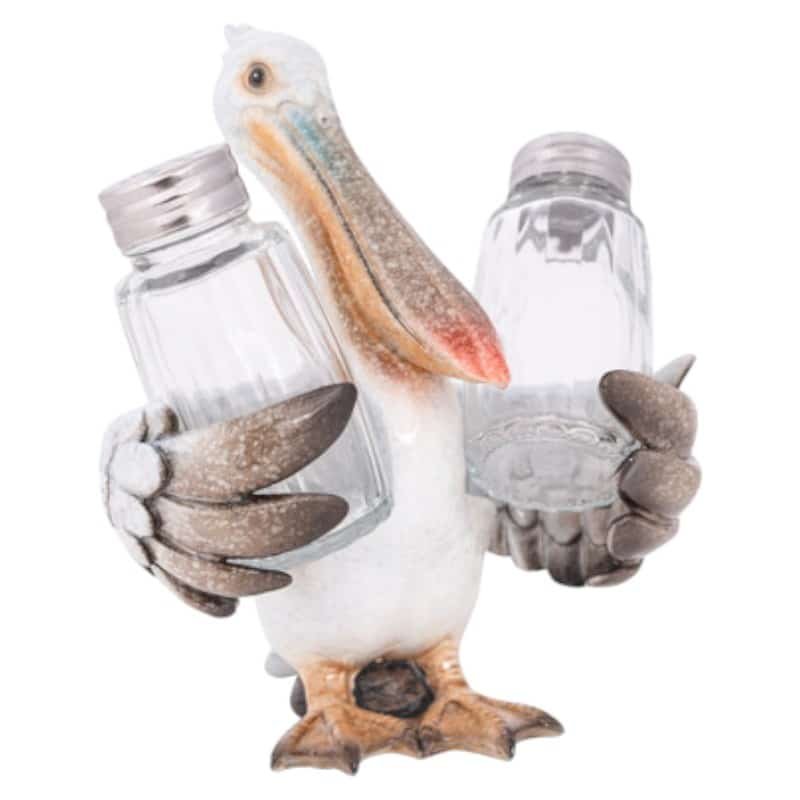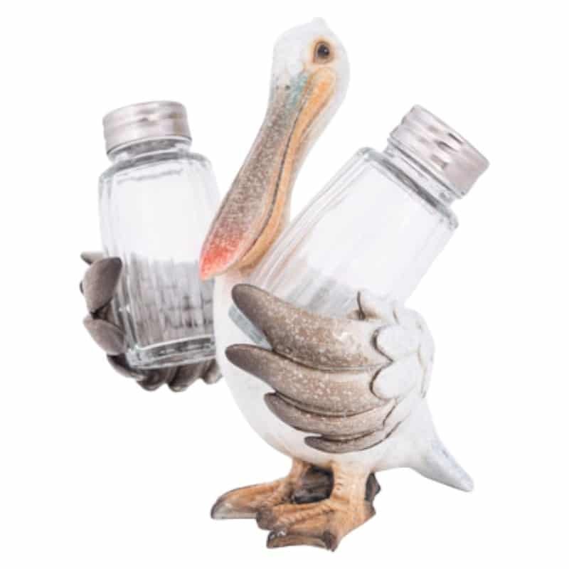 This Polystone White Pelican Holds Metal and Glass Salt and Pepper Shakers In His Wings – He’s Cute, He’s Useful, and He’s a Seaside Decoration Waiting and Hoping That It’s Going to Fish for Dinner That Needs His Seasoning