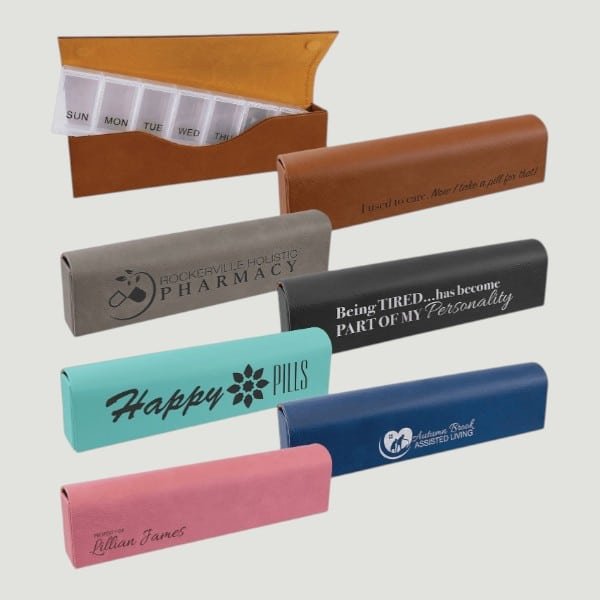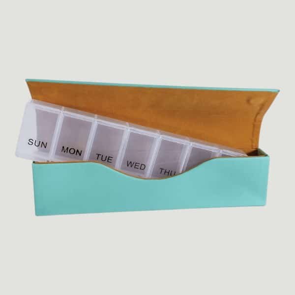 This compact Pill Case is perfect to slip into your purse, briefcase, or suitcase for a safe way to travel with the pills you need, or to have them ready to go at home! Inside the Leatherette case is a plastic organizer with 7 large compartments labeled with the days of the week.