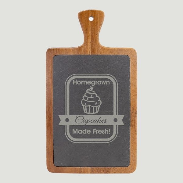 This custom engraved solid wood cutting board with handle can be customized to suit. It makes a wonderful wedding or house-warming gift! It is also a beautiful, useful piece to add to your own kitchen, and use to host your favorite guests. This cutting board is made of slate and solid Acacia wood.