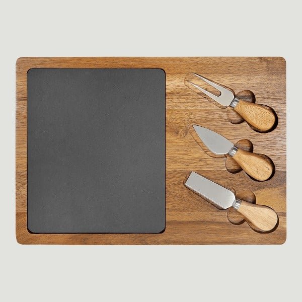 13 3/4″ x 9 3/4″ Acacia Wood/Slate Rectangle Cheese Set with Three Tools