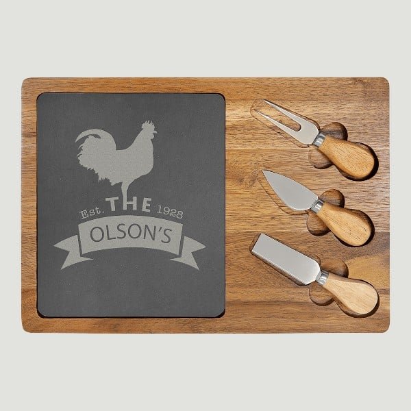 This attractive cheese set features a Slate cutting board framed by Acacia Wood, along with 3 tools (a cheese serving fork and 2 knives)on the front and a beautiful Acacia Wood back. Both can be personalized with the graphics of choice. If you’re looking for a great personalized gift for a wedding, house warming, or just about any occasion, This may be it!