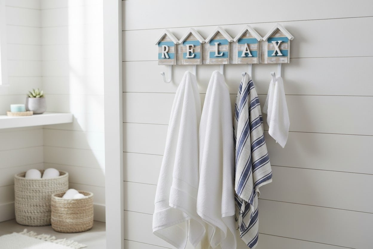 - INCLUDED WITH THE PURCHASE OF COASTAL WALL SIGN – Includes 1 CoTa Global Aqua Sky 5 Hook Nautical Wall Sign that features a Relax text with beach house design with rustic accents and distressed texture. Adorned with intricate details and 5 hook hangers colored in white and blue color. Fits perfectly in any existing sea-themed room decor. The beachy wall decor sign measures 19.5Lx1.7Wx7.2H and fits perfectly as nautical hanging decor.