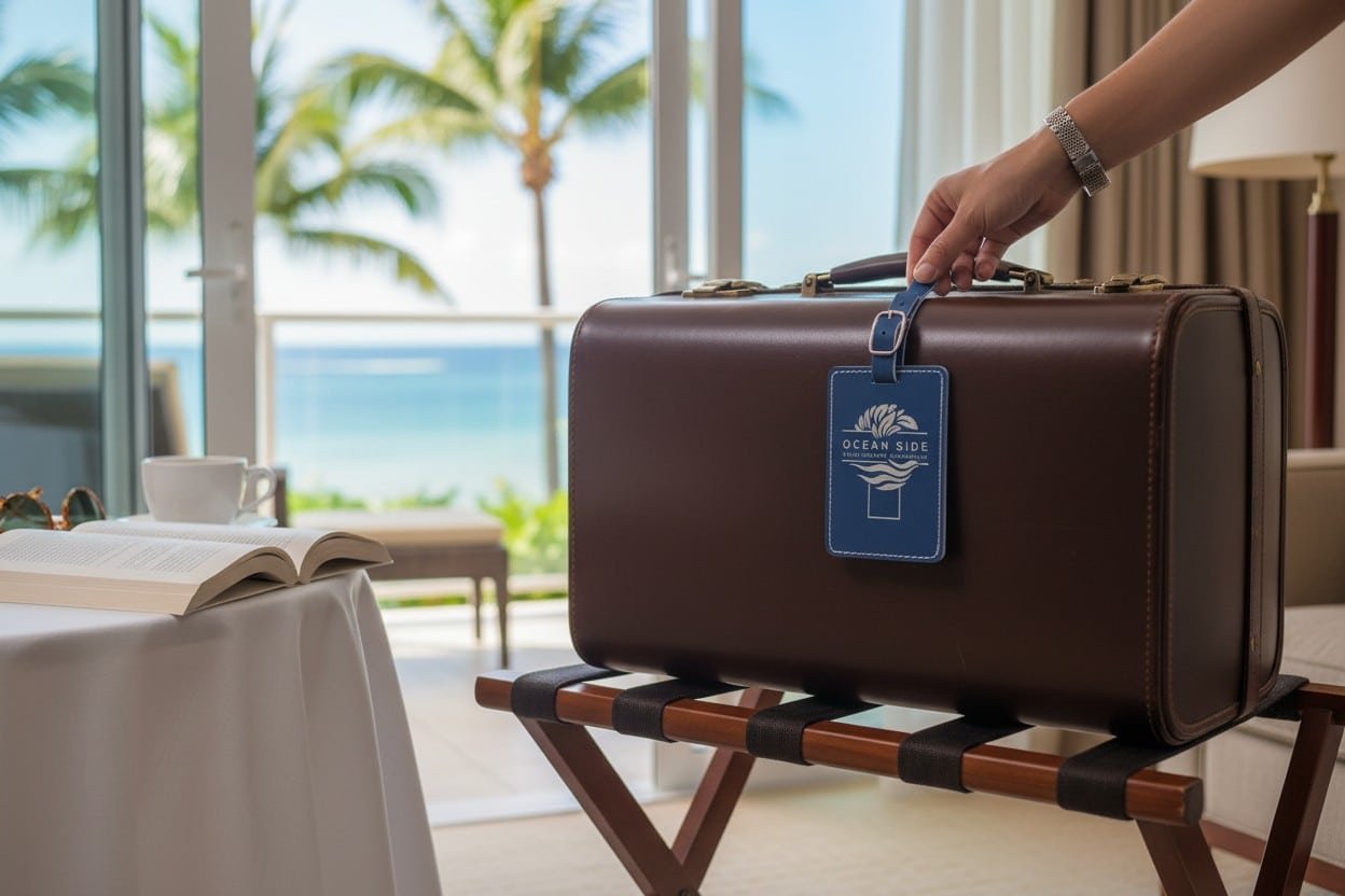 4 1/4″ x 2 3/4″ Blue/Black Laserable Leatherette Luggage Tag. Laserable Leatherette offers the look and feel of genuine leather at a fraction of the price. This richly textured, synthetic material resists water spots, cleans easily, and is durable enough for the rigors of daily use. The high quality workmanship of each leatherette piece is sure to impress every recipient with its elegant individuality.