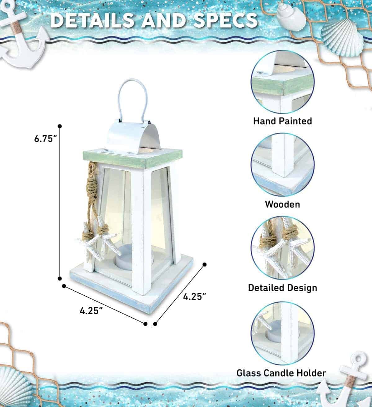 - HIGH QUALITY HANDMADE BEACH LANTERN DECOR – Made of premium quality wood, the glass lantern with handle is built with light materials adorned with starfish. The Ocean Breeze white candle lantern beach home decor is meticulously crafted, painted by hand—a fresh-looking beach decor for the home. Maintain the small wood lantern by gently wiping with a cloth. Coastal decor candle lantern are perfect lantern centerpieces for tables