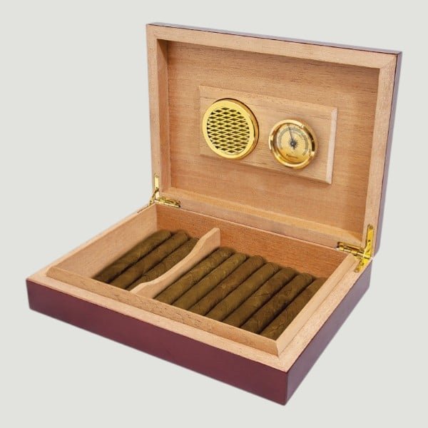 Rosewood Piano Finish Humidor , inside of Humidor is Spanish Cedar and the lid contains a hygrometer & humidifier attached with a magnet. Underside of box is lined with black velvet. Humidor has a gold hinges in back, a divider and will hold 45-60 average 6″ cigars. Care and instruction sheet included. great for corporate gifts and commemorations