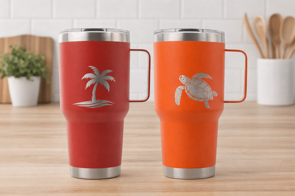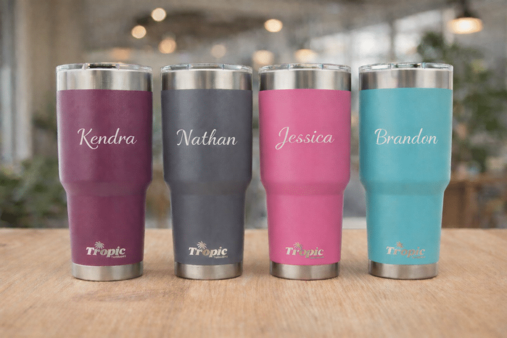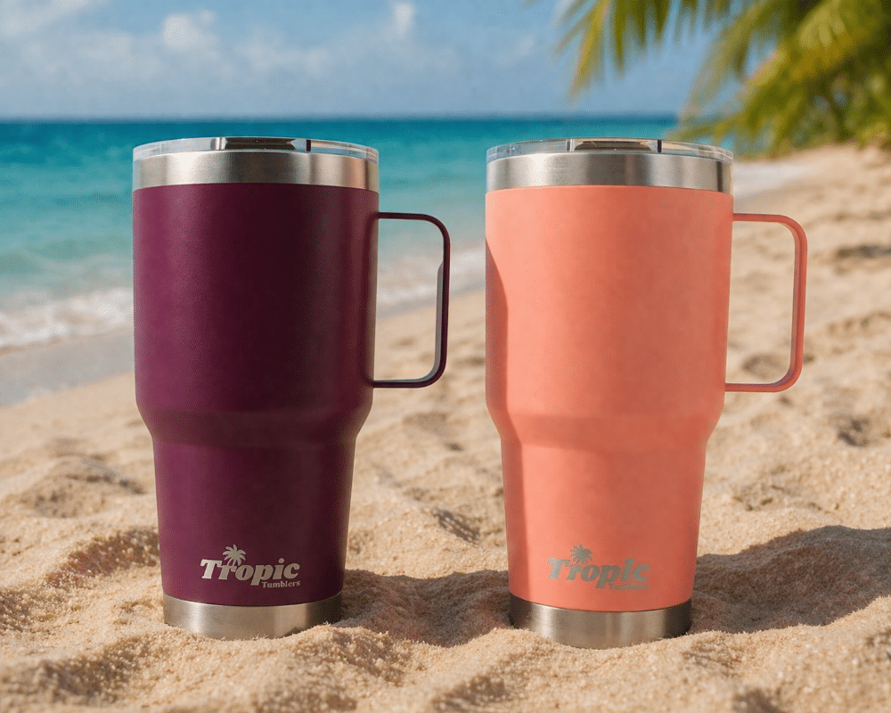 - Tropic Tumblers Inc. have a No Sweat Design to make sure your hands stay dry. The tough, dura coat finish coating on the colored tumblers won’t crack, peel or fade