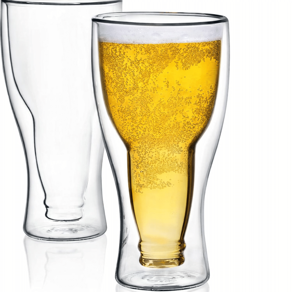 13.5 oz Clear Double Wall Insulated Beer Glass - Upside Down Design - Holds One Full Bottle.